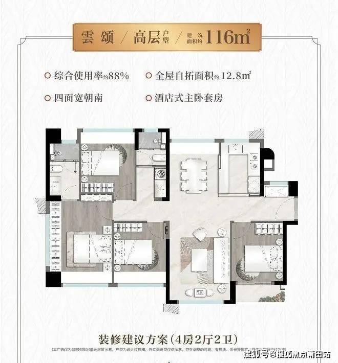 116㎡四房两卫:L型跑道阳台,部分房源可俯瞰海景,得房率88%。