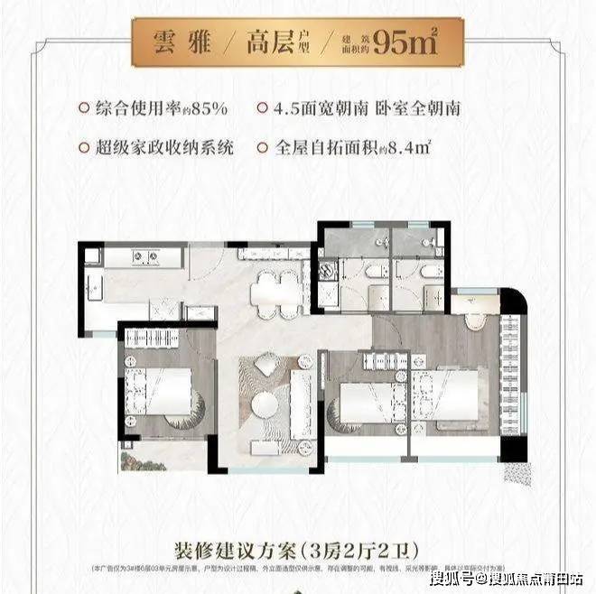 95㎡三房两卫:4.5开间朝南,主卧套间三面采光,得房率85%-89%。