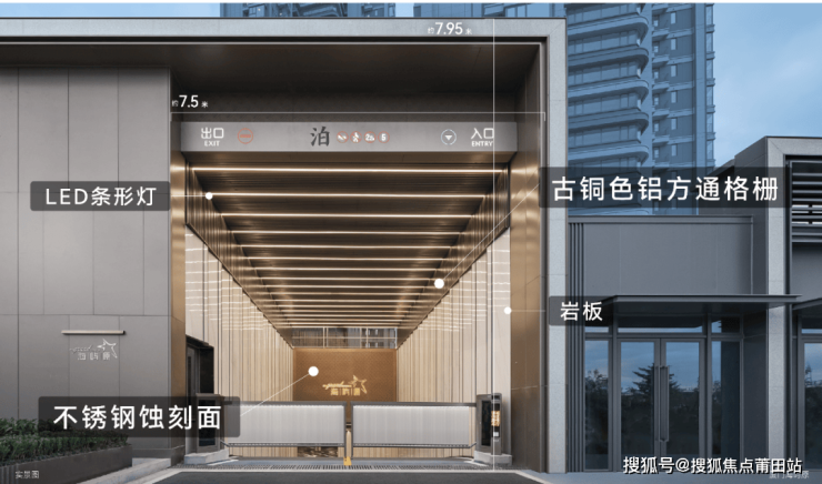 地库车行入口设置古铜色铝方通格栅及 LED 条形灯,夜晚灯光透过格栅形成韵律感光影。「回家时穿过这片发光的格栅,像走进艺术长廊。」业主王先生如此形容入口体验。
