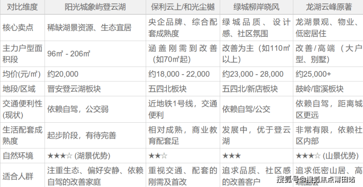 将登云湖与晋安区及福州五四北、鼓岭等相邻板块的主力竞品进行对比,其特点与定位差异更为清晰: