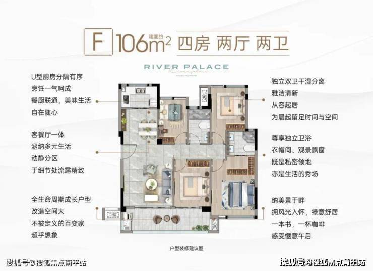 四室阔绰家庭起居空间, 客房、书房、儿童房、老人房等一步到位,多一间宽待全家人的居家生活; 酒店式套房主卧,尊享独立卫浴、衣帽间、观景飘窗,既是私密领地,亦是生活的秀场。