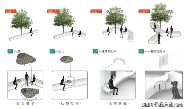 另一种则是多人外向型,同样是弧形长椅,但呈现出树叶的分散状,让交流多了更多可能