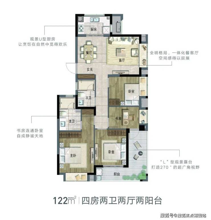 3. C1 -122㎡户型:四房两厅两卫设计,户型结构合理,南北通透。入户即达餐厅、客厅,减少就餐活动路线。U型厨房空间较大,方便家务开展。干湿分离的卫生间避免潮气、脏物带进居室。卧室、书房与阳台相连,采光通风极佳。