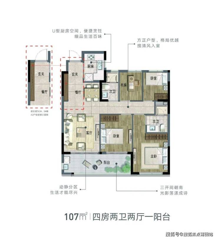 1. A2 -107㎡户型:四房两厅两卫设计,动静分离,格局方正。入户即达餐厅、厨房,减少就餐活动路线。客厅连接阳台,视野宽阔。餐客厅一体化设计,连接阳台,空间视野广阔。书房与活动区相隔,保障阅读环境的静谧。主卧带独立衣帽间、卫生间,居住空间大,舒适度高。