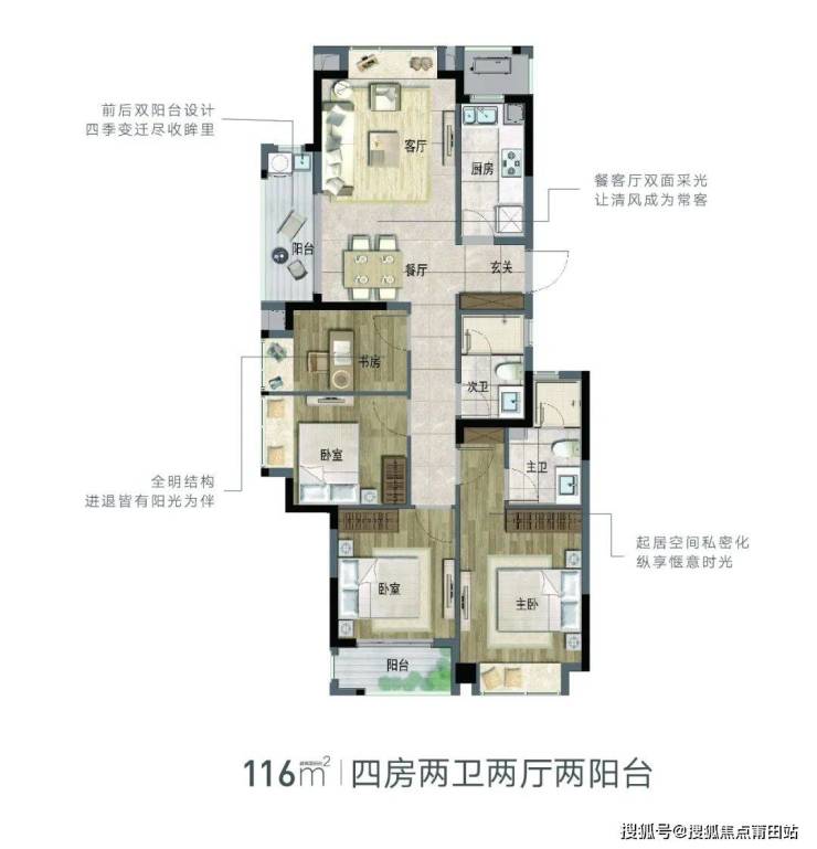 2. B1 -116㎡户型:四房两厅两卫设计,功能齐全,南北通透,全明结构。玄关入户,举步即达厨房、餐厅、客厅和阳台,动线明晰。主卧带独立衣帽间和卫生间,居住空间大。双阳台设计,全明户型,视野宽阔,采光充足。