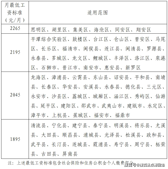 今年1月27日,福建省人力资源和社会保障厅公布了福建调整后的月最低工资标准、非全日制用工小时最低工资标准以及适用范围,新标准自2025年4月1日起执行。具体标准如下——