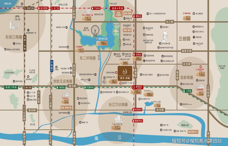 榕发湖樾最引以为傲的是其不可复制的地理优势。项目直距晋安湖仅约700米,为业主提供了稀缺的城市湖居体验。交通方面,项目具备真正的“双轨地铁房”属性,距离已通车的地铁2号线与在建的4号线换乘站前屿站仅约200-320米。从此出发,1站可达宜家,2站直达台江万达或世欧王庄,3站即达东泰禾广场,5站抵达东街口,能够快速对接福州全城核心商圈。