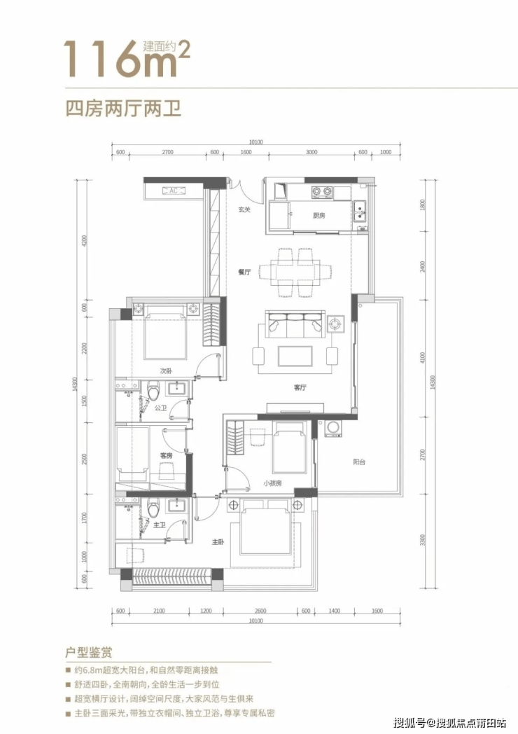 可做到全功能四房空间,约6.8米大阳台,主卧南北通透,带独立衣帽间,三面采光。