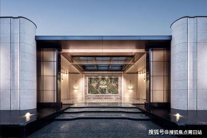 项目前场采用酒店式的主入口,打造三进隐奢归家艺术之门:轴对称式水景倒映着入口大堂与景墙的尊贵气派,品位典雅;源自法国卢浮宫的三角切面与矩形组合构成了博物馆般的大堂。