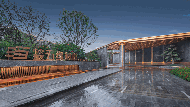 中交建发五缘海悦,整个门仪系统以退红线的方式处理,公园与廊道之间,以艺术格栅区隔,相互渗透,既有区隔于城市的私密感,更有城市资源纳入社区的私享感。这既是地块本身的天赋,也是规划的用心。