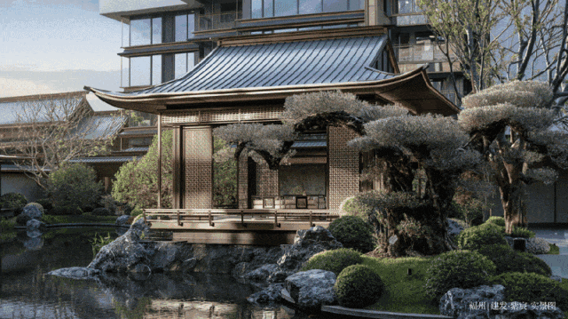 宋式美学园林:以宋代造园手法打造景观,疏密结合、高低错落,全冠移植六大百年名树,搭配太湖石、亭台楼阁,让归家之路成为穿越宋画之旅;