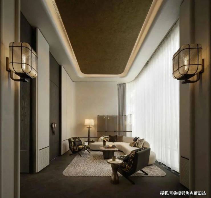 整面的无框玻璃幕墙邀景入室,让视野无限延伸。下沉设计巧妙地将人的视线与户外景观水系融于同一水平面上,外部绿树成荫的草地、若隐若现的建筑轮廓与室内的精致设计相映成趣,勾勒出人与自然共生的生活画卷。