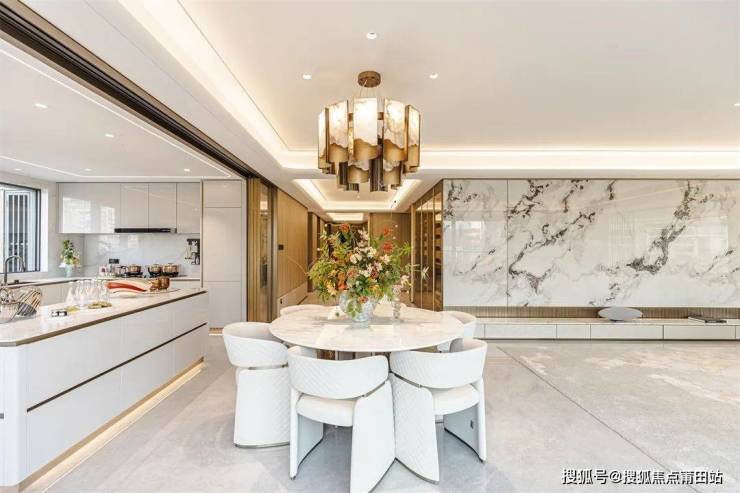 超大厨房,既满足中厨的煎炒烹饪,亦可实现西厨的优雅时光。经典白色厨柜,以铝合金勾勒利落线条,呈现拉丝铜的精致美感,呼应空间奢华调性。岛台拉手围合安装,让厨房的每个细节都充满质感。厨柜踢脚氛围灯,提升空间亮度,营造悬浮效果,将柔和、舒适的氛围一点点弥漫开来。