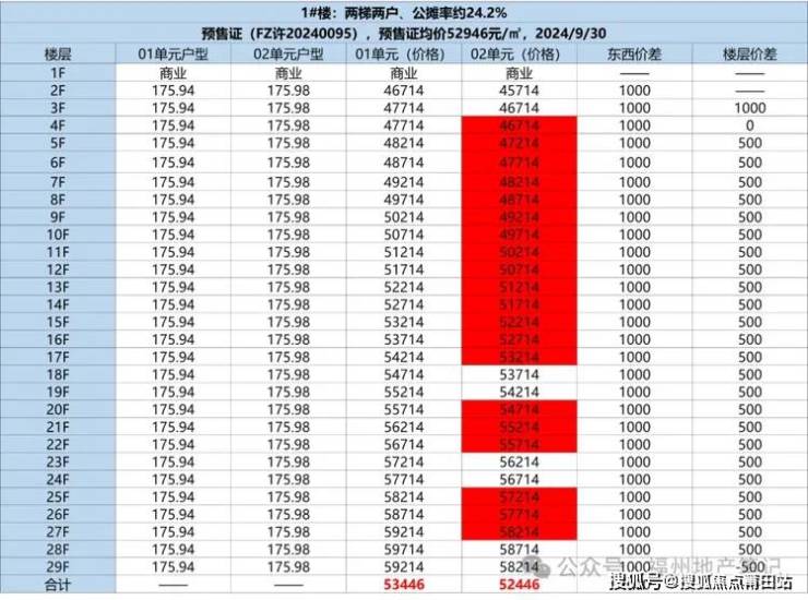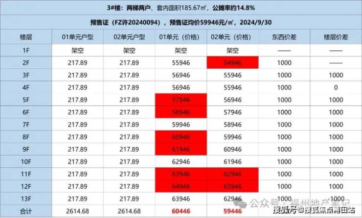 东西端户价差500元/㎡,01、02单元价差1000元/㎡,02、03单元价差500元㎡。