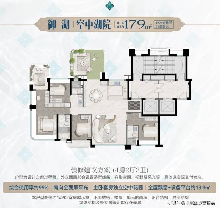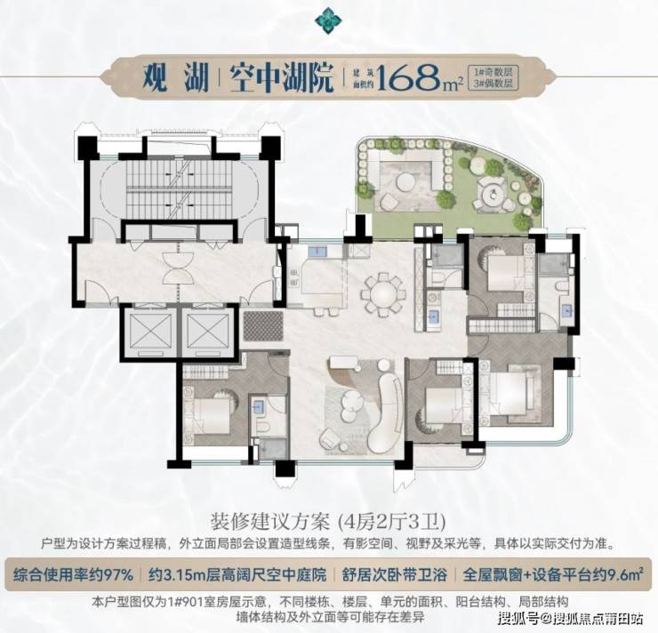 168㎡-179㎡空中湖院:综合使用率约97%、约3.15m层高阔尺空中庭院、舒居次卧带卫浴全屋飘窗+设备平台约9.6㎡;综合使用率约98%、约3.15m层高双空中庭院|舒居次卧带卫浴、全屋飘窗+设备平台约11.5㎡。综合使用率约99%|南向全面屏采光、主卧套房独立空中花园、全屋飘窗+设备平台约13.3㎡;综合使用率约96%、南向全面屏采光主卧套房独立空中花园|全屋飘窗+设备平台约10.9㎡