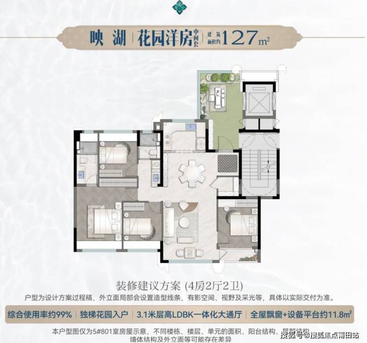 125㎡-127㎡花园洋房:综合使用率约101%、采光花园前厅|主卧270°观景落地窗、全屋飘窗+设备平台约14.0㎡;综合使用率约99%|独梯花园入户|3.1米层高LDBK一体化大通厅|全屋飘窗+设备平台约11.8㎡。