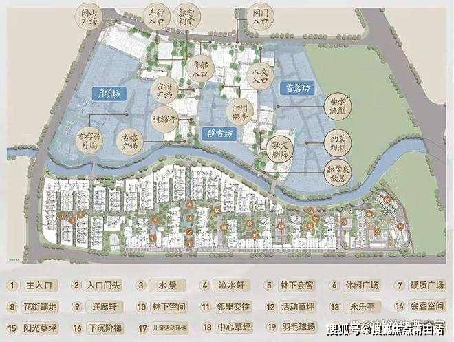 保留32栋明清古建,12棵古树,修复历史古桥,约1.0的容积率,215亩稀缺地块,提供平层、院墅、古建商业,主打中式庭院生活。