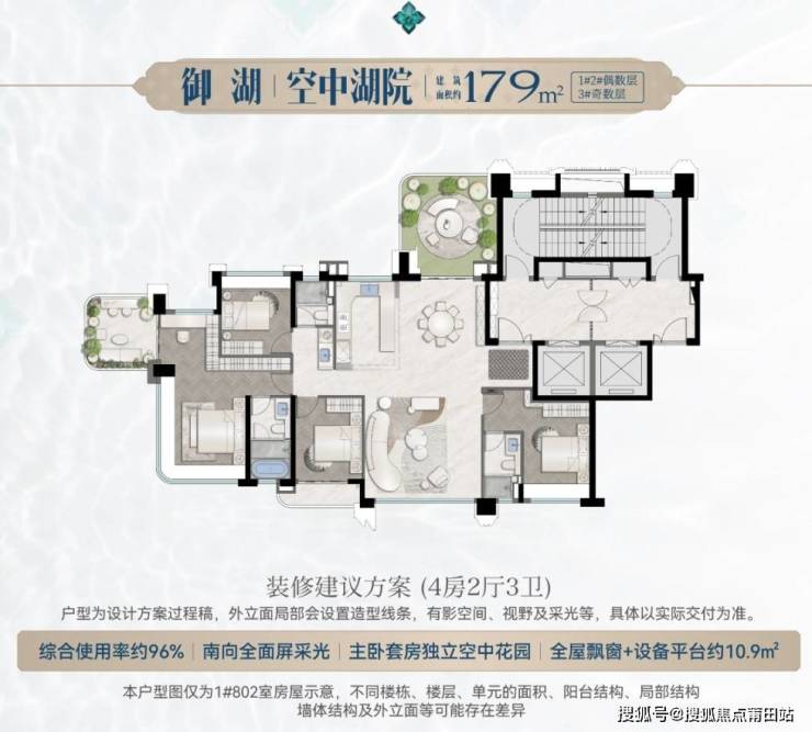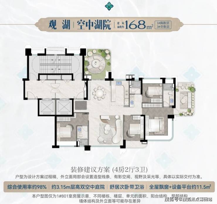 168㎡-179㎡空中湖院:综合使用率约97%、约3.15m层高阔尺空中庭院、舒居次卧带卫浴全屋飘窗+设备平台约9.6㎡;综合使用率约98%、约3.15m层高双空中庭院|舒居次卧带卫浴、全屋飘窗+设备平台约11.5㎡。综合使用率约99%|南向全面屏采光、主卧套房独立空中花园、全屋飘窗+设备平台约13.3㎡;综合使用率约96%、南向全面屏采光主卧套房独立空中花园|全屋飘窗+设备平台约10.9㎡