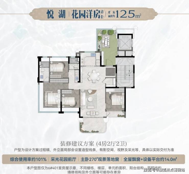 125㎡-127㎡花园洋房:综合使用率约101%、采光花园前厅|主卧270°观景落地窗、全屋飘窗+设备平台约14.0㎡;综合使用率约99%|独梯花园入户|3.1米层高LDBK一体化大通厅|全屋飘窗+设备平台约11.8㎡。