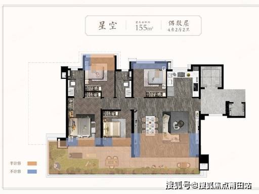 全系155-230㎡四房 / 五房,两梯两户,得房率约95%-122%,空间媲美别墅。