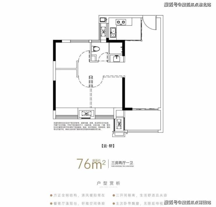 建面约76㎡三房,以同等面积多一房设计,挑战空间实用极致。L型厨房、餐客阳台纵向一体,成倍延伸三开间朝南的横向开阔感。二环谨此面积段三房产品,让更多新客户也能轻松住进二环。