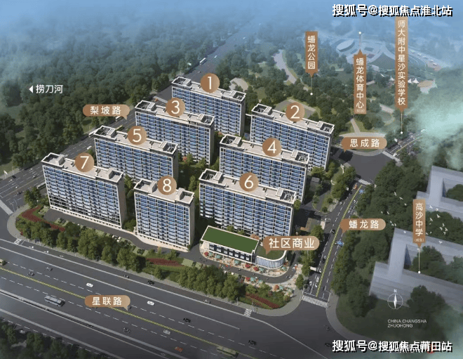 生态配套:项目周边有长沙园林生态园、松雅湖、捞刀河及白沙河四大生态环绕,蟠龙公园(规划)、蟠龙体育中心(规划)坐落于项目北侧。