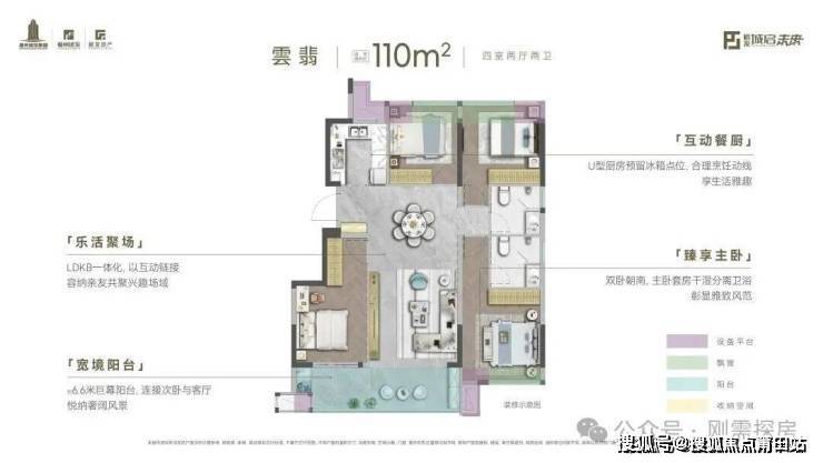 110平:洋房的四房产品,空间使用率高达97.5%,通过“飘窗全赠送+阳台半赠送”,实得面积超108㎡,很好的满足了刚改家庭的四房居住需求。
