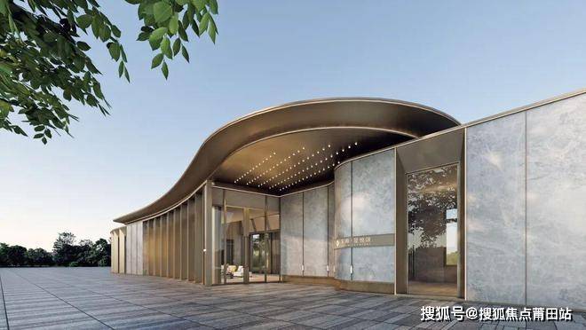 比如星悦颂大门,极具酒店轻奢风,用材选用大面落地玻璃窗+香槟金铝板型材+大面岩板景墙组合打造,弧形挑檐点缀,时尚大气。