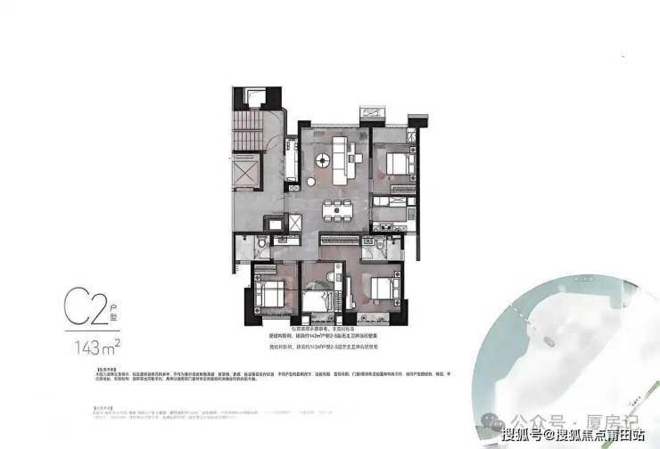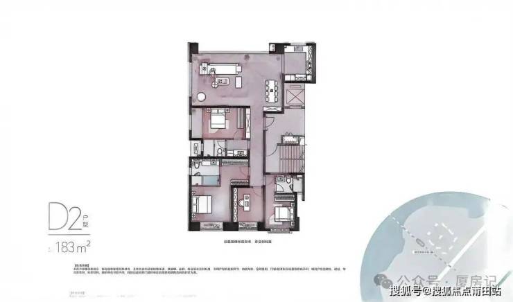 •主打100㎡ -131㎡-143㎡-183㎡-201㎡刚需改善至高端改善型三至四房户型;100㎡为3室2厅1卫,131㎡为3室2厅2卫;143㎡和183㎡为4室户型,其中183㎡户型带独立玄关,13米宽巨幕观景厅搭配270°环幕视野,部分户型采用LDK一体化设计,主卧套房面积超30㎡,还配备独立浴缸及双盥洗系统,可观赏湖海双景;