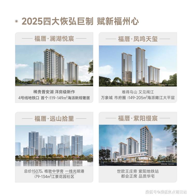 福厝地产脉承福州建工26载深厚营造基因与城市担当,2025年敬献四大恢弘巨制:福厝·澜湖悦宸,福厝·凤鸣天玺、福厝·远山拾里、福厝·紫阳缦宸,迭新福州改善人居时代。