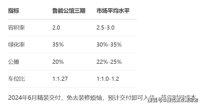 项目定位改善型社区,容积率2.0,绿化率35%,公摊20%,物业费3.0元/㎡,车位配比1:1.27,各项指标均高于市场平均水平。