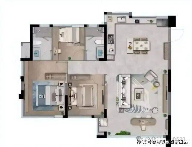 优点就是三个房间都有较好的采光,缺点是厨房和餐厅采光有所缺失。