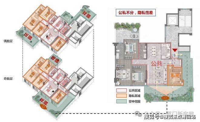 动线分离术:奇数层客厅直联露台(公区),偶数层主卧退居内侧(私区),实现动静切割