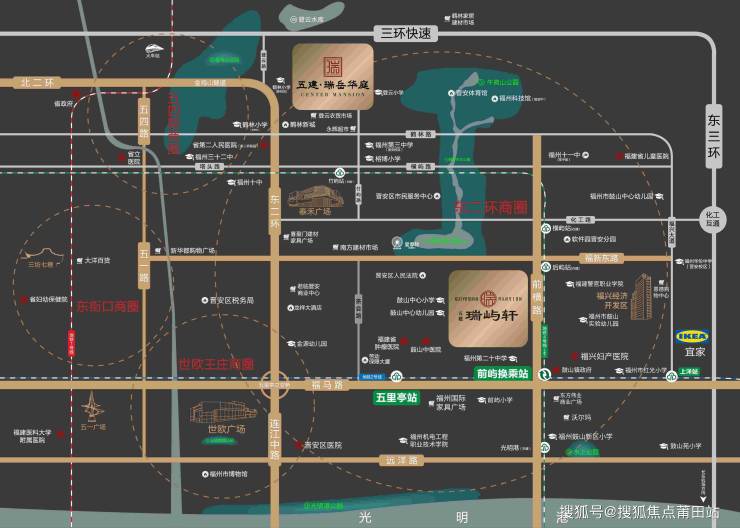 作为一个综合性住宅项目,五建•瑞屿轩周边环绕有三大商圈,包括东二环泰禾商圈、宜家商圈和王庄商圈,居民可以方便地享受到丰富的购物和娱乐选择。同时,附近还有鹤林生态公园、牛岗山公园和晋安湖公园(建设中),为居民提供了休闲放松的场所。