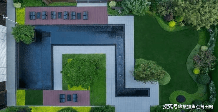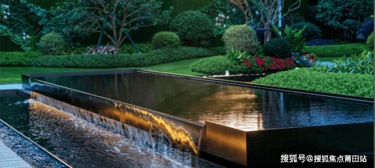 天光水境:几何线性水带,贯穿住区。水景沿黑色砾石的台阶潺潺而下,晨昏时分水雾氤氲,折射虹彩。