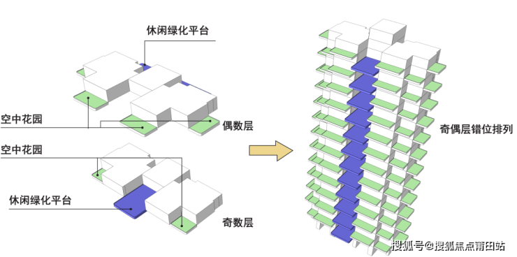 通过把地面的庭院搬到都市上空,让每一层拥有一个公共庭院,每户享有自己的私人庭院,可以种花种菜,遛狗养鸟,也让建筑的外墙成为布满植物的“景观”。