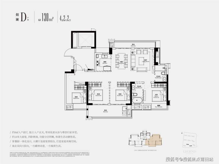 户型亮点:129-222㎡大平层设计,270°曲面封窗,注重空间通透感。