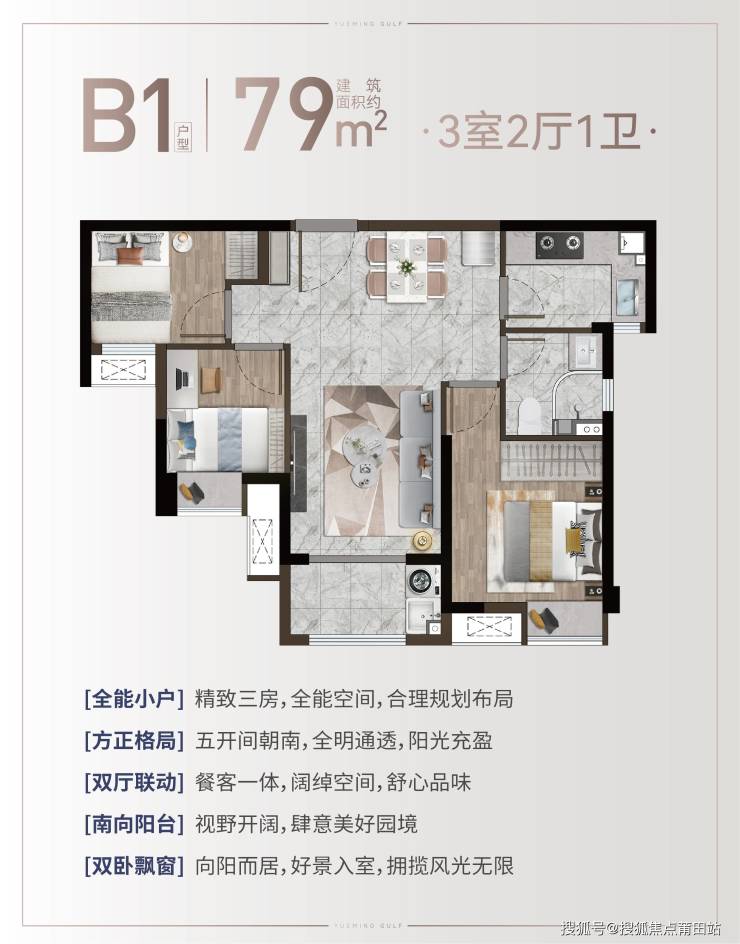 79㎡三房:五开间朝南,南向面宽10.5米(超多数80㎡+户型),L型厨房操作空间大,公摊率仅 18%-22%,实际得房率85%+,总价172万-220万,首付50万起。