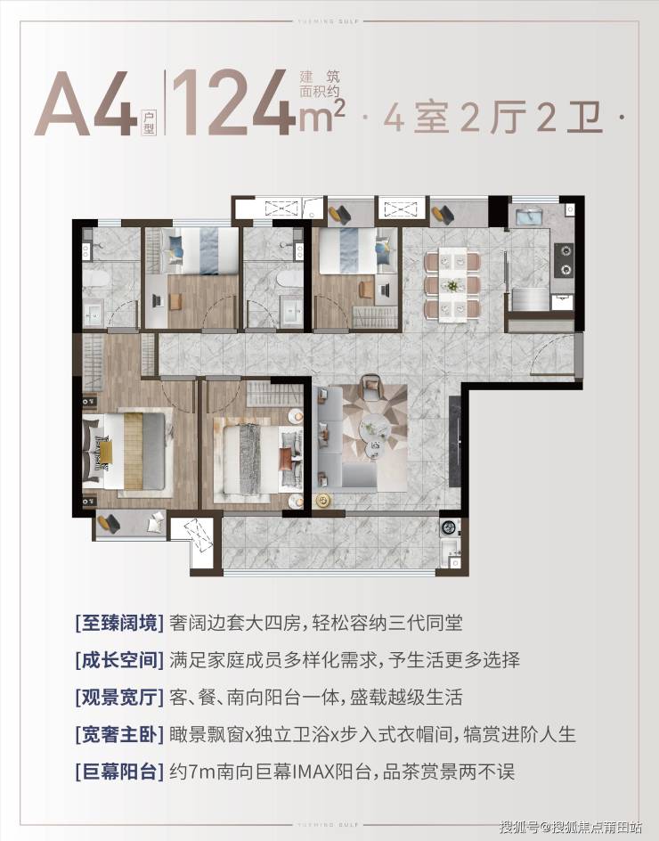 115-124㎡四房:横厅设计(客厅面宽4米),7米南向阳台,主卧套房+独立衣帽间,适配三代同堂。