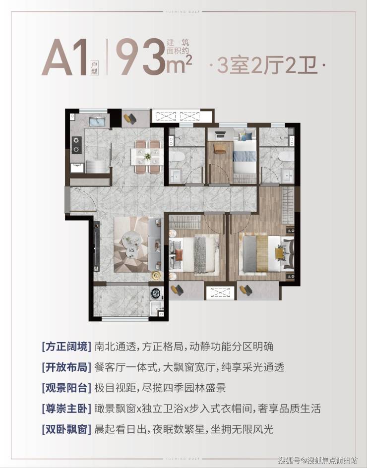 93㎡边套三房:南北通透,双卫设计,动静分区明确,总价218万起。