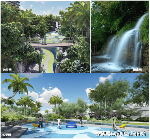 3.水岸园林:以水为景观框架,排布山谷花园、嬉水花园、滨河花园三大景观点,勾勒出清幽密林、10米高差瀑布、吊桥廊亭、平台栈道相融的花园式园林,四季有景,奇趣无穷。