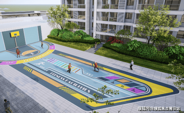 【全时段运动空间】楼下健身房、约7000㎡运动场、长约1400m跑道、篮球场。