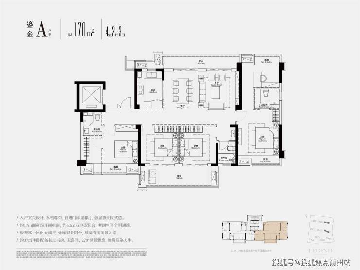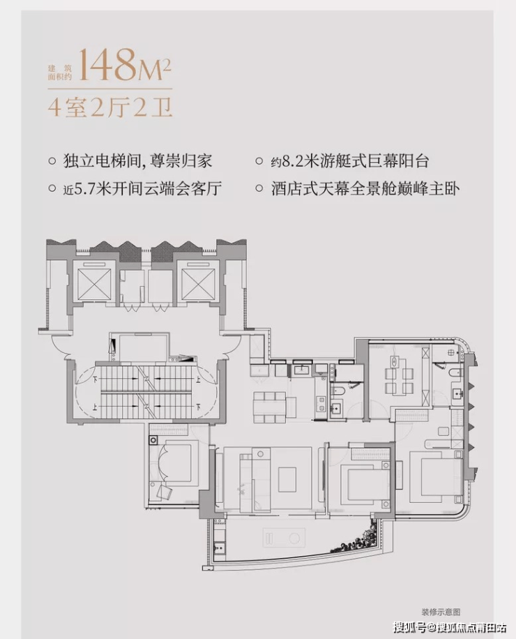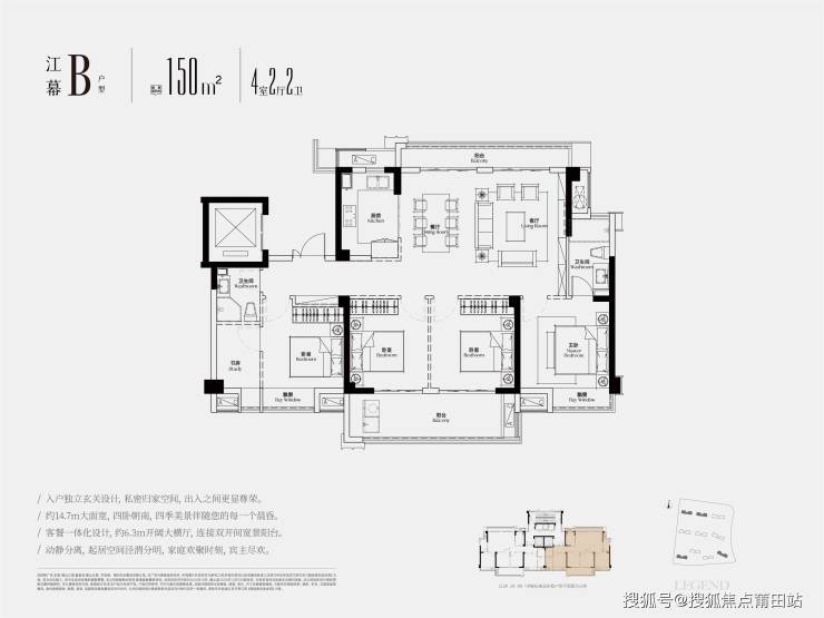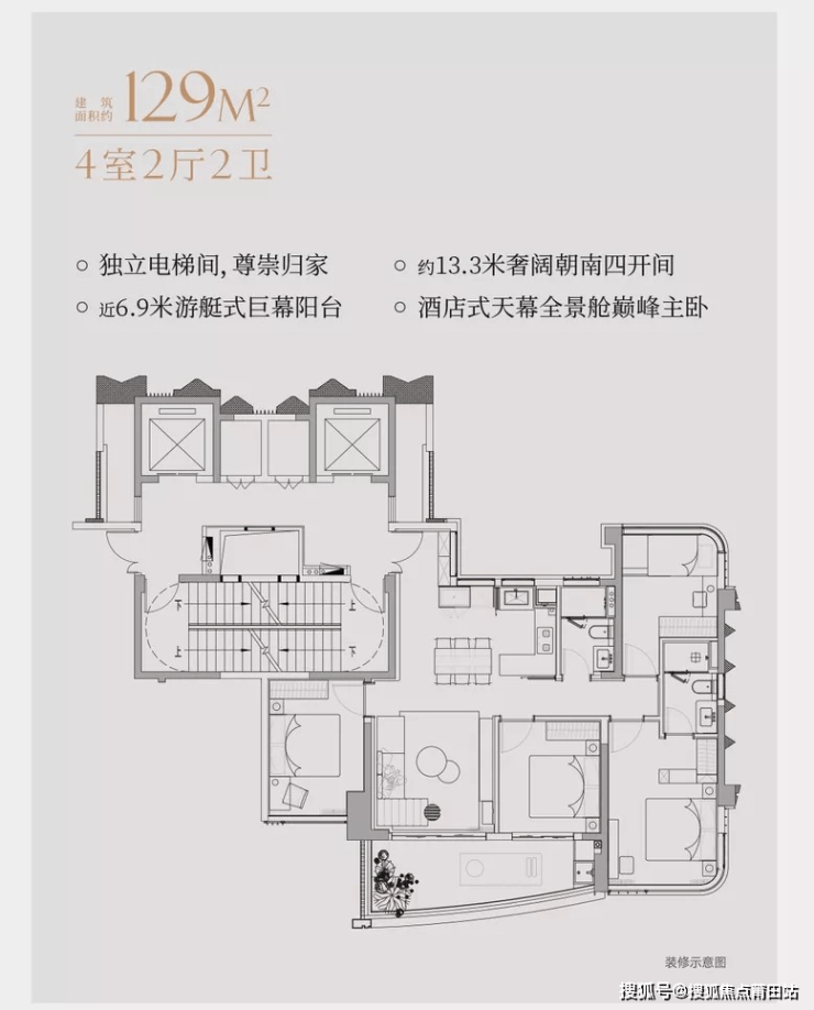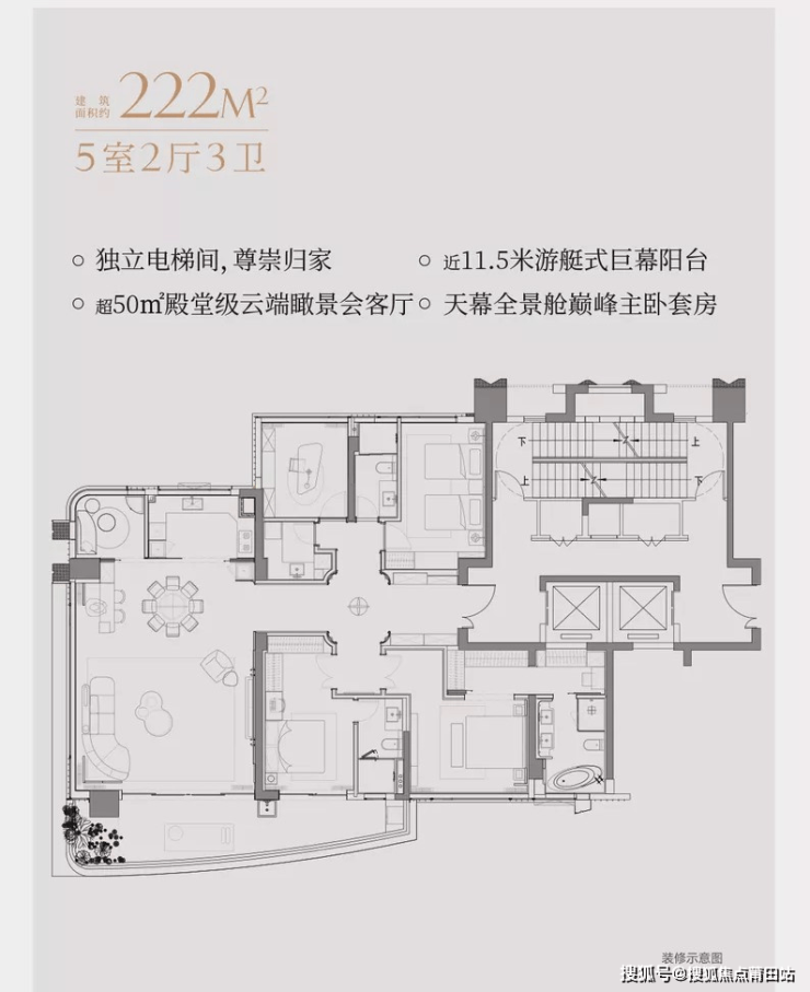 户型亮点:129-222㎡大平层设计,270°曲面封窗,注重空间通透感。