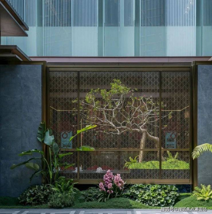 大堂外的第一个小景观,已经用屏风前相互环绕的铁冬青、叠水、涌泉宣告了这个楼盘的景观浓度。隐在拐角处的山石与紫薇,透过廊柱带来了四季变换的物候感知。