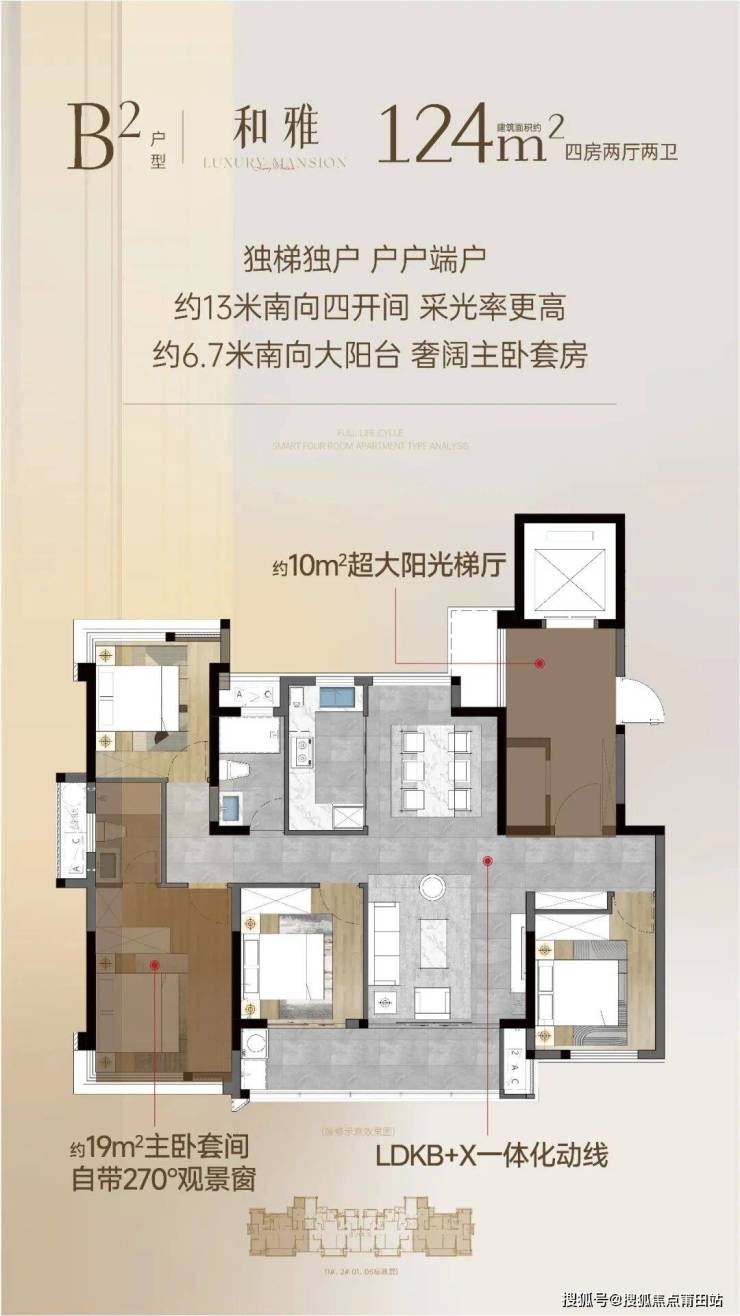 主力在售建面约124㎡全景端户,拥约6.7米南向大阳台、约13米南向大开间,三面采光通透敞亮;LDKB+X一体化动线设计,空间可灵活改造,适配多孩及三代同居家庭结构。独梯独户布局,在提升私密性与尊崇感的同时,更彰显出纯粹改善住区的产品初心。