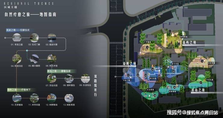 外临水岸,内藏森屿,社区规划流波、游岛、森屿三大主题意境,一轴七园复合园林景观。让社区成为集艺术、健康、疗愈于一身的多功能生活社交空间。