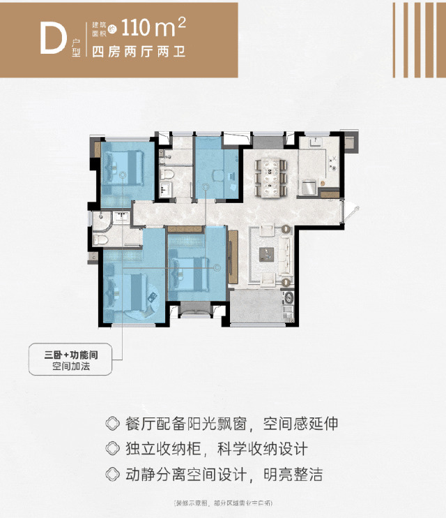 建发·叁里云庐的110㎡边套大四房户型,是项目中的典藏房源,余量已告急。该户型南北通透,动静分离,功能分区明晰,完美满足二胎家庭或三代同堂的居住需求。主卧、次卧及多功能房的布局,既保证了私密性,又提供了灵活多变的空间利用可能。餐厅的阳光飘窗,实现了阔绰的采光面,而客厅的IMAX级全景落地窗,则让您一览园林盛景,感受自然的拥抱。