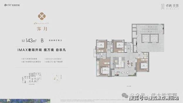 1.143㎡四房两卫:该户型有横厅与端厅两种设计可供选择,南向采光面长达15米,实现了充足的采光和通风。采用LDKB一体化布局,将客厅、餐厅、厨房、阳台有机融合,形成一个宽敞通透的公共活动空间,增强了家庭成员之间的互动性。主卧配备270°观景窗,不仅视野开阔,还能让业主躺在床上就能欣赏到美丽的景色,提升居住的品质感。