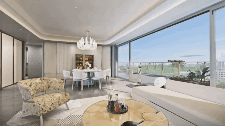客厅与花园庭院间是一道落地的玻璃门,人们坐在室内客厅,就能直接将花园庭院的“四季美景”尽收眼底,真正让美景在室内无限扩张,让空中花园价值最大化彰显!