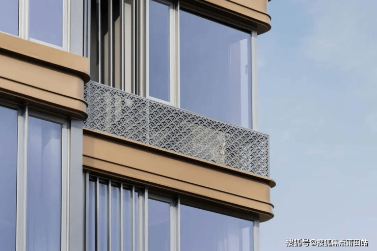 空调外机装饰面放弃了百页或者格栅,定制了雕刻着项目取自烟台山银杏叶的LOGO花纹的穿孔铝板。